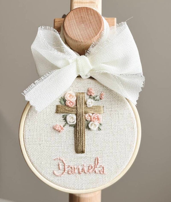 Nuestra crucecita de flores en su versión mini, perfecta para regalo de bautizo o comunión. Por su tamaño, queda ideal colgada en la cuna o moisés de los más pequeños.